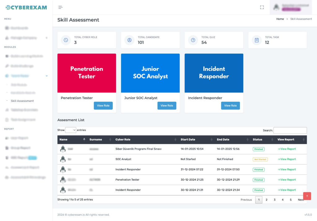 Select role-based assessments (SOC, Pentest, IR, Engineering) aligned to your hiring needs.